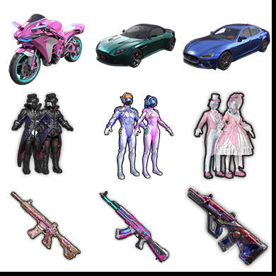 〓十载具八特效枪十二粉〓火箭少女兰博基尼玛莎拉蒂合金龙骨梦幻摩托阿斯顿马丁〓M4心之恋语AK炫紫SCAR迷兔AUG...