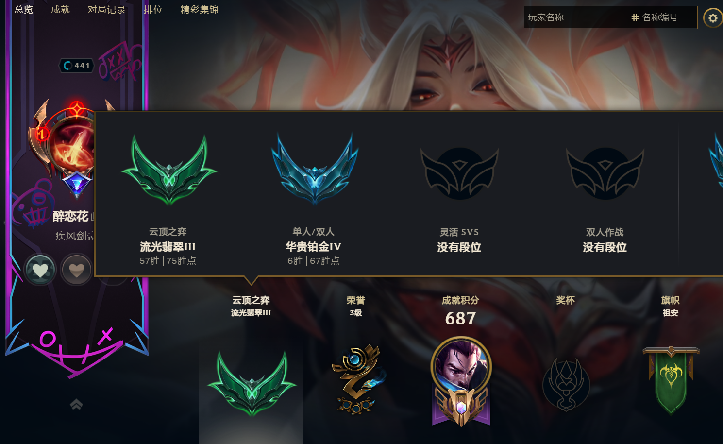 角色等级:441 角色名:醉恋花 排位赛:允许 单双排段位:华贵铂金IV 灵活组排段位:- 英雄数量:172 皮肤数量:233 云顶段位:无段位 分销起租时长:2